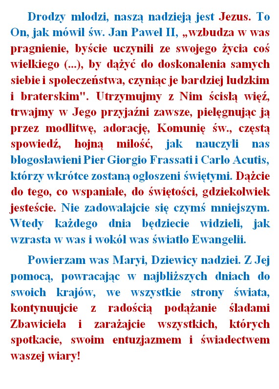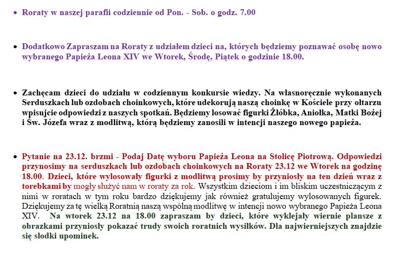 Wszystkim dzieciom i Młodzieży składam serdeczne podziękowania za wspólne wędrowanie po wydarzeniach z życia naszego nowego Papieża Leona XIV. Dzięki, tej wędrówce mogliśmy poznać jego osobę jaki był jako dziecko oraz potem młody chłopak przez jego lata jak został zakonnikiem misjonarzem biskupem Kardynałem na końcu Papieżem. Mogliśmy poznać jakich Świętych miał ulubionych i jak czerpał z nich wzór do naśladowania. Mogliśmy w każdym dniu spotkań poznać jego wskazówki pomagające nam w chrześcijańskim życiu. Dziękuję wszystkim, którzy brali udział w wykonywaniu ozdób choinkowych , które będą zdobiły naszą choinkę przy ołtarzu. Dziękuję tym, którzy odpowiadali na codzienne pytania konkursowe uzupełniali sobie plansze z obrazkami dotyczące wydarzeń z życia papieża Leona. Dziękuję tym, którzy przez losowanie figurek z modlitwami zanosili do Pana Jezusa Wielką Modlitwę w intencji Papieża Leona. A oto ostatnie wskazania nie tylko do młodzieży zgromadzonej na Jubileuszu młodych ale także do nas uczestników tegorocznych rorat.