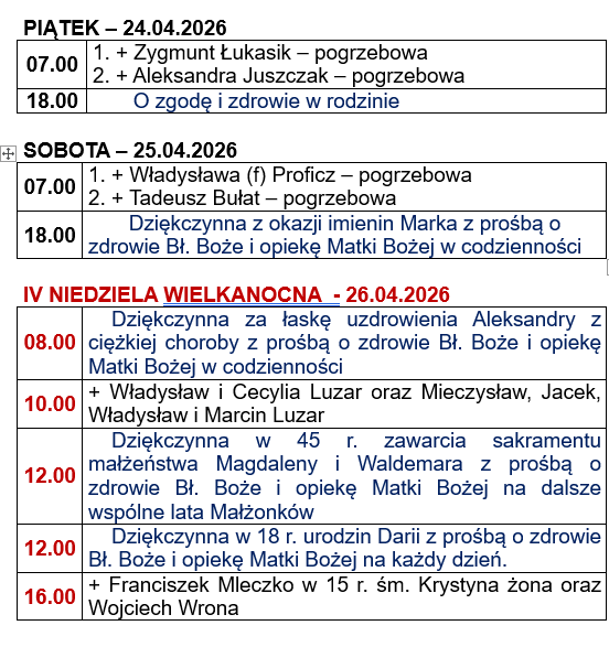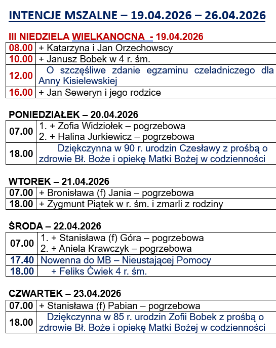INTENCJE MSZALNE – 19.04 – 26.06.2026